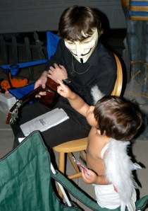 [My son portrays “V for Vendetta” with an unphased, visiting Halloween angel. @2007 ANVidean]