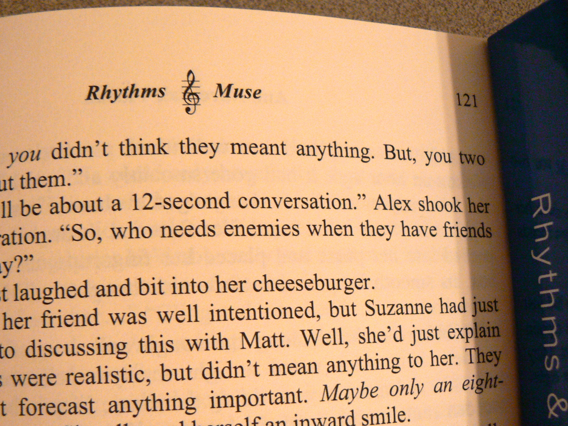 • The professional editor of my initial Rhythms & Muse manuscript pointed out that I did not include any current-day scenes with my hero anywhere in the first half of the book. What? I couldn’t belief my oversight. Her input contributed to creating a much more complete, seamless, self-published novel, and helped make it interesting enough to rate almost all 5-star reviews on Amazon.